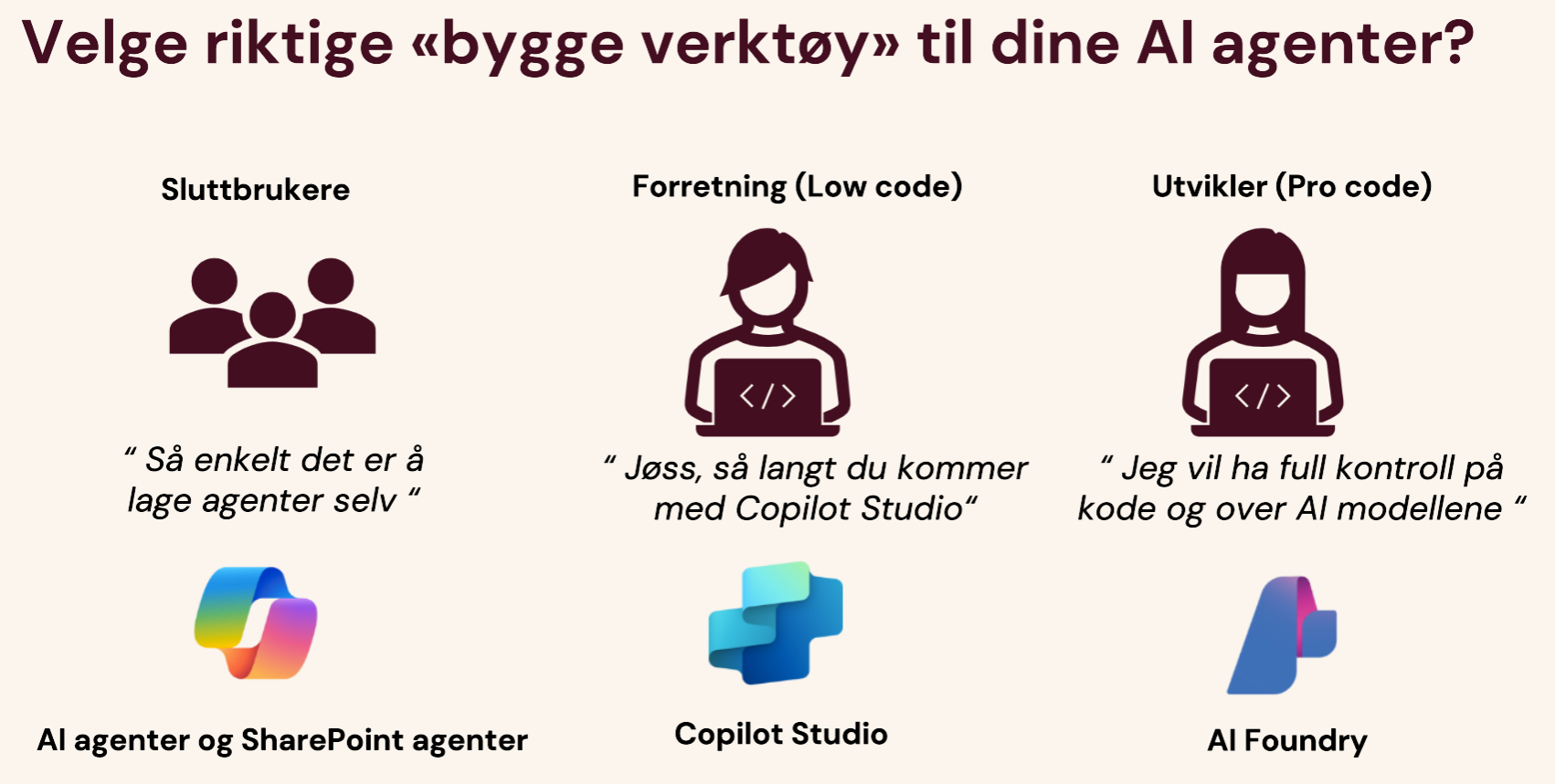 For de som ønsker å komme raskt i gang uten å skrive kode, tilbyr Microsoft no-code AI-agenter direkte i kjente verktøy som SharePoint og Microsoft Copilot for M365.